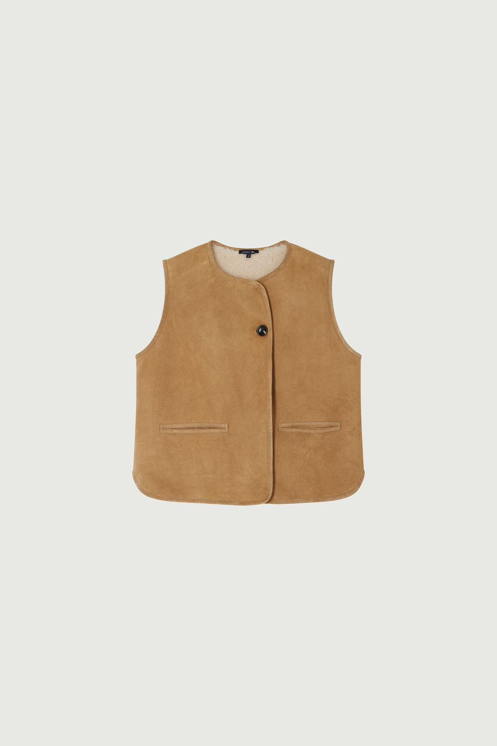 BOULOGNE is a sleeveless lamb leather jacket with a sleek straight cut. This jacket features a sophisticated design and is reversible, offering two different looks. It's designed as a versatile vest that can be styled endlessly. Slip it under a coat without restricting movement, or layer it over a simple knit jumper.