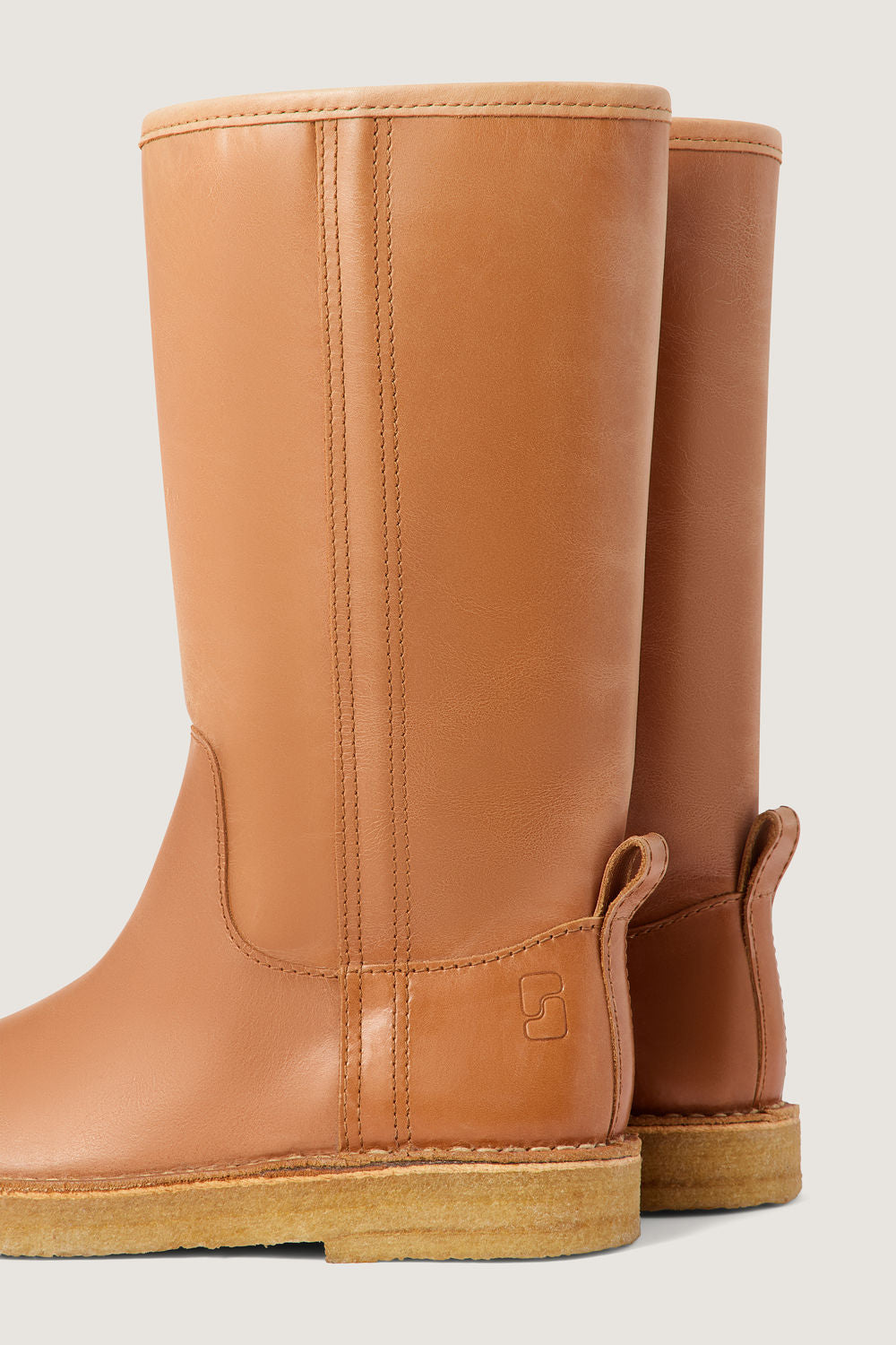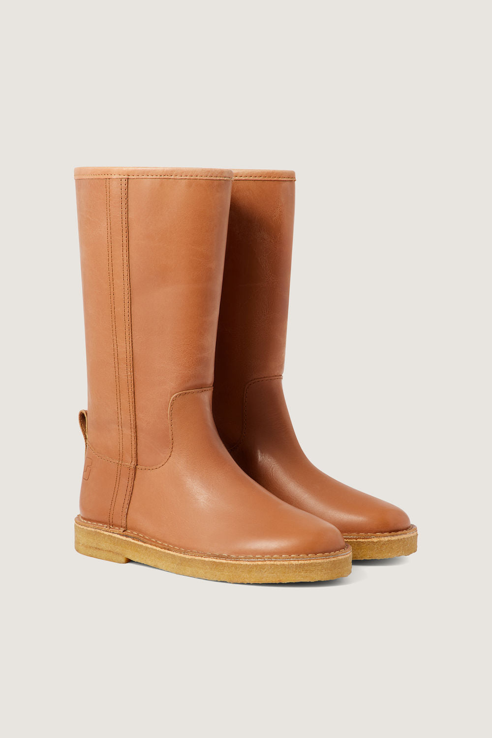 Cognac leather boots - Straight, wide slip-on boots- Thick crepe sole- Stem height 30cm- Heel height 3cm- Leather LWG